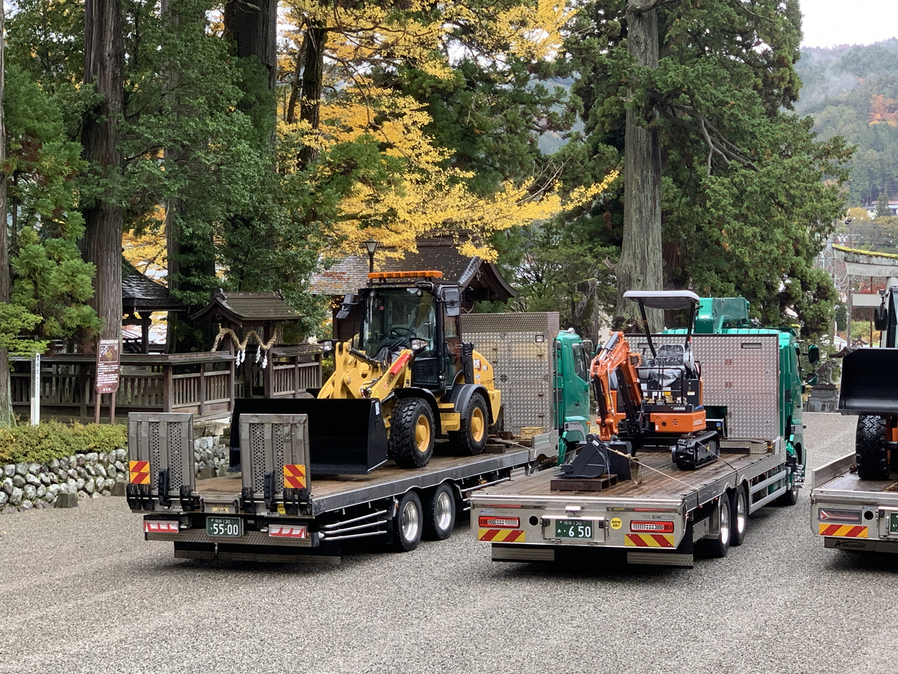 11月10日、シモダ道路では納車されたばかりのホールローダCAT907と日立建機ミニ油圧ショベルZX20Uの車祓いに行ってまいりました。